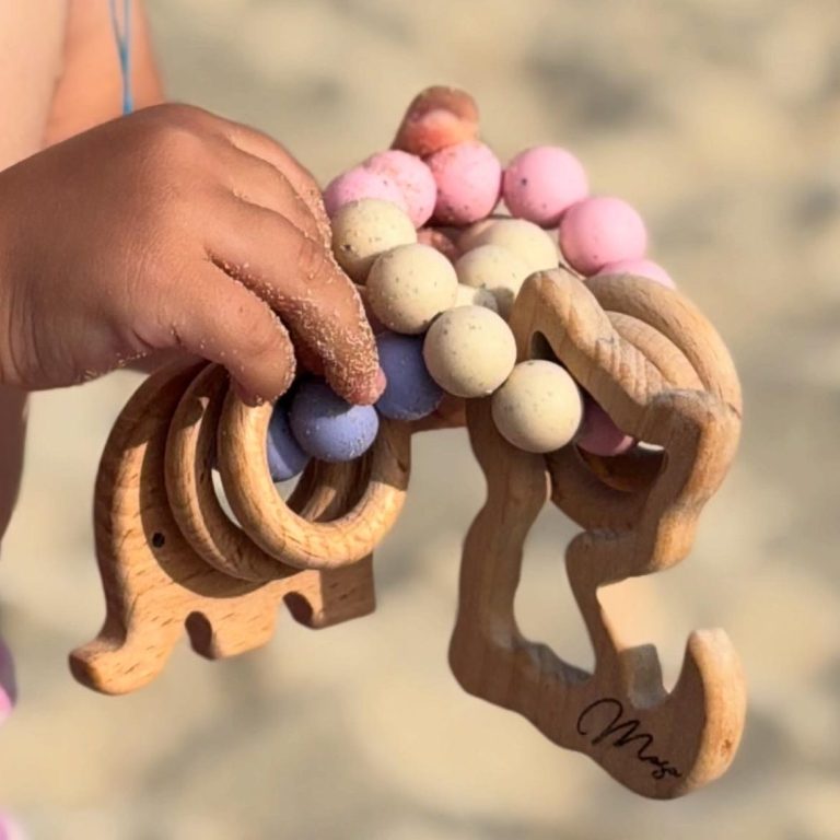 - Stimuliert die Sinne durch unterschiedliche Materialien (Buchenholz & Silikon)